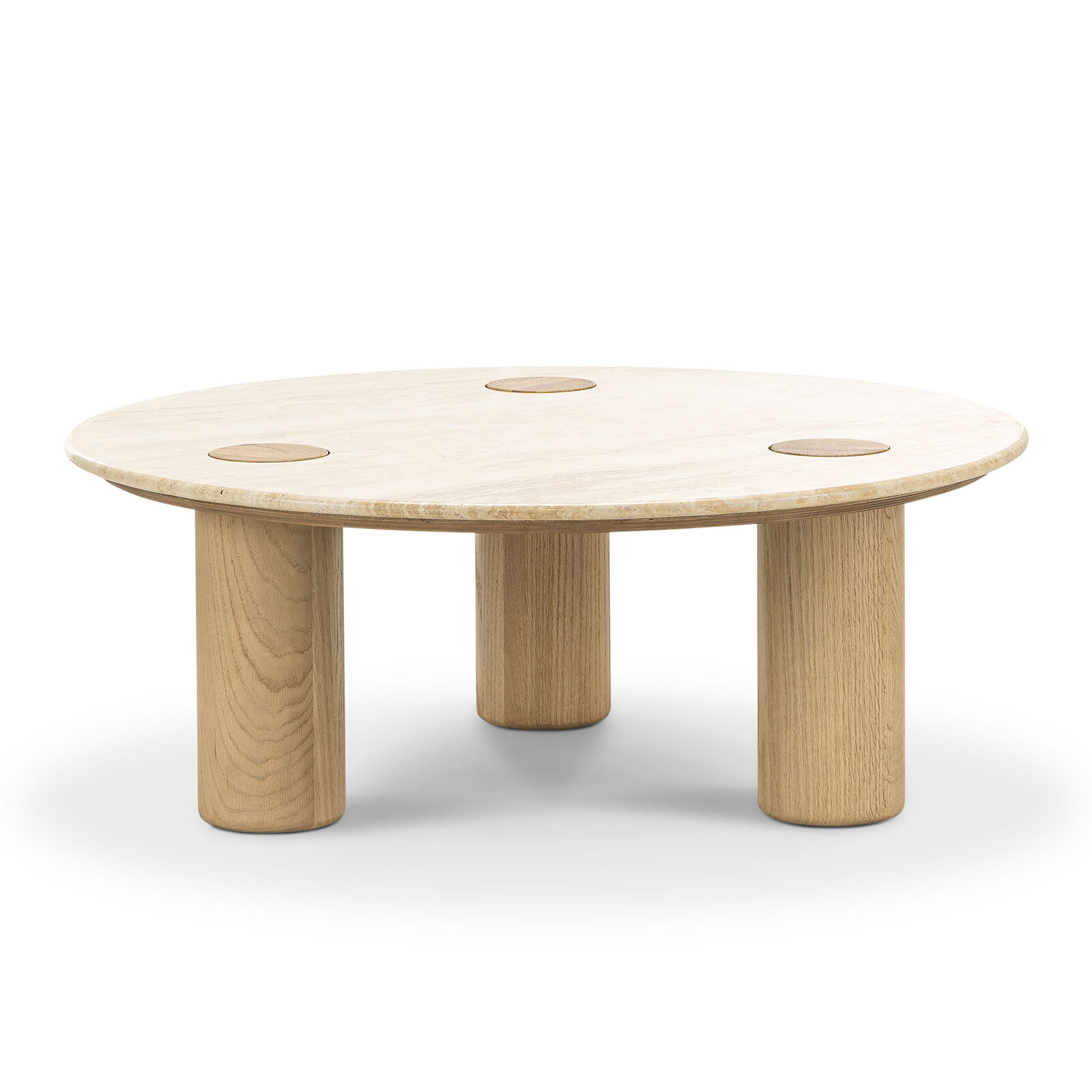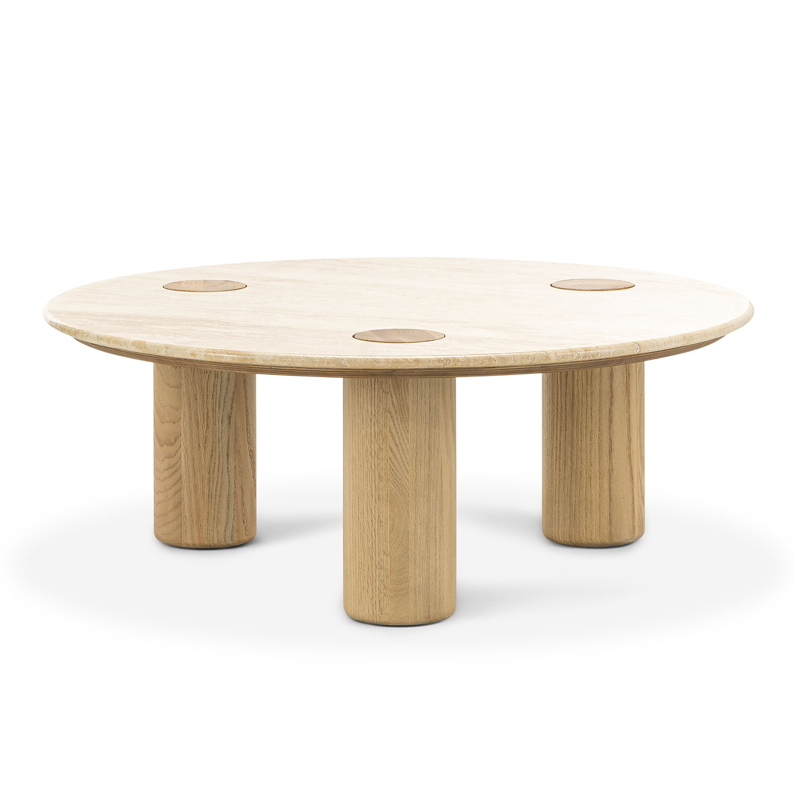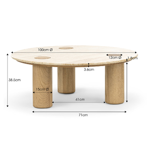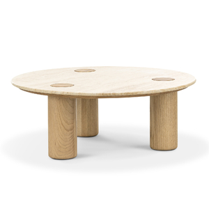 The Ayra Travertine Round Coffee Table brings grounded elegance to contemporary living, where natural materials tell their own story. Its expansive surface showcases nature's craftsmanship through soft cream hues and distinctive veining patterns, artisan-trowelled and matte-polished to enhance visual depth. Where timber meets stone, three oak ring insets create a distinctive design signature—supported by substantial cylindrical pillar legs that establish a striking interplay between cool stone and warm timber. Embracing Wabi-Sabi philosophy, the Ayra celebrates the stone's inherent imperfections and authentic character that makes each piece truly individual, anchoring your home with quiet confidence.