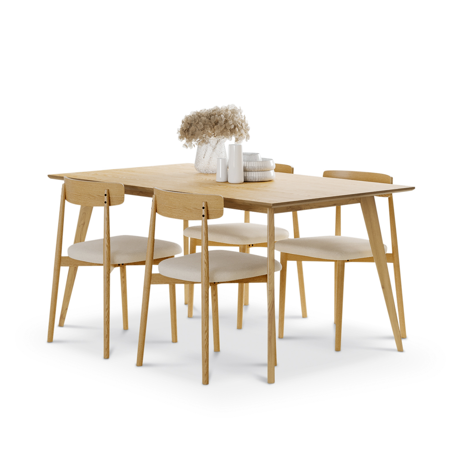 The Bruno 5 Piece Dining Set with Finn Natural Beige Oak Chairs has been personally curated to effortlessly complete your dining space.