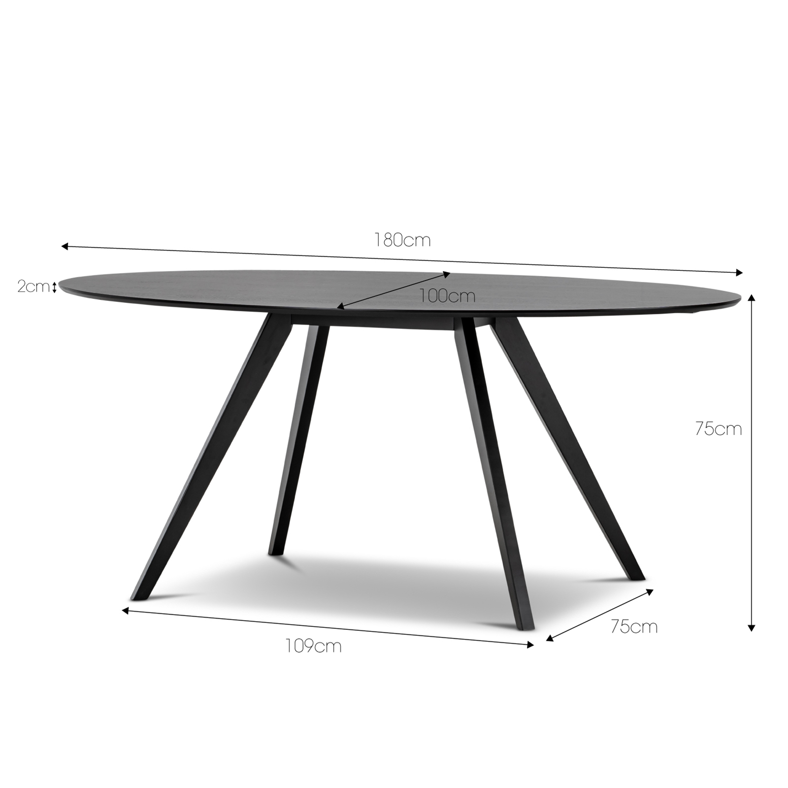 Introduce graceful curves and style into your home. The solid black oak veneer dining table features a natural flowing oval shaped top and solid timber legs. While the accompanying chairs are the epitome of dining in comfort. Swathed in premium Bouclé upholstery, the matte black steel frame contrasts beautifully against the cream of the seat and backrest. and crafted with sleek lines and graceful curves, the set will make a statement in any dining space.