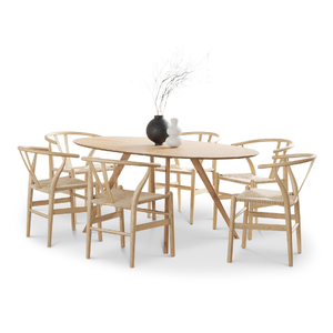 The Carol 7 Piece Dining Set with Arche Solid Ashwood Wishbone Chairs has been personally curated to effortlessly complete your dining space.