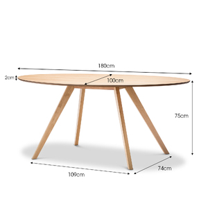 Introduce graceful curves and style into your home. The solid oak veneer dining table features a natural flowing oval shaped top and solid timber legs. While the signature chairs showcases a tapered design, curved back railing and finished with hand-woven rattan seating. This set is both versatile and pairs with a wide range of interior styles from Coastal, Scandi and Japandi to the Modern Minimalist.