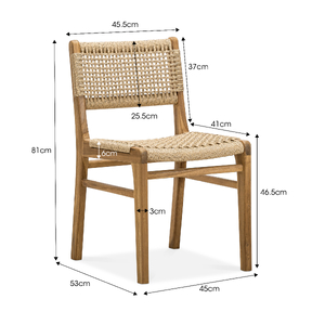 The Elias Woven Cord Dining Chairs celebrate the art of considered craftsmanship. European design sensibilities meet Mid-Century allure in a piece where soft rounded corners and clean geometry create an effortlessly refined presence. Built from solid teak with a matte raw finish that showcases the wood's natural character, each chair features handwoven synthetic Ecolene rattan across both seat and back in a distinctive sea-grass style weave. The interplay between organic timber and precisely woven cord delivers both visual texture and lasting comfort. The Elias brings Coastal Boho warmth to dining rooms that value authenticity and attention to detail.