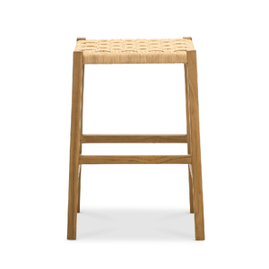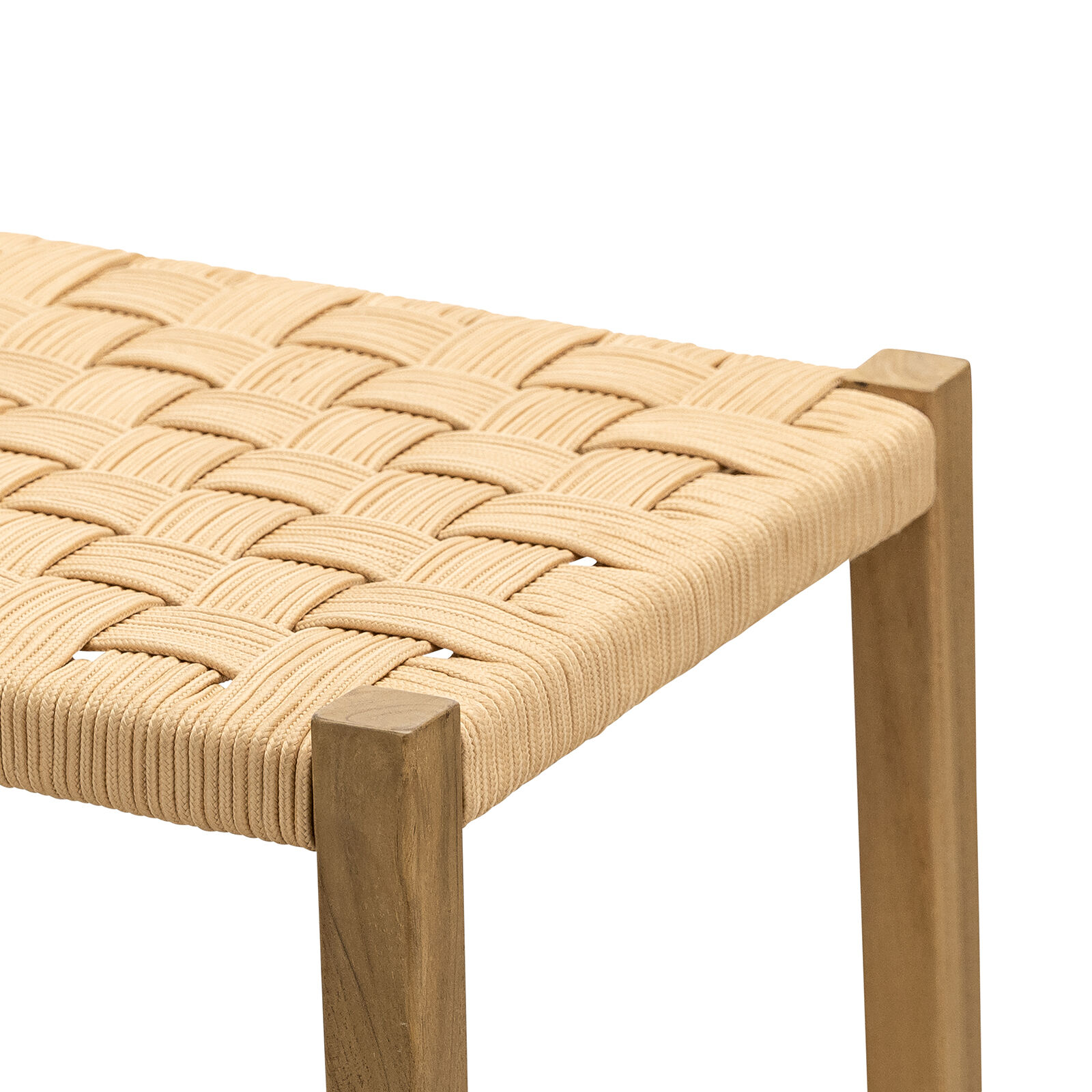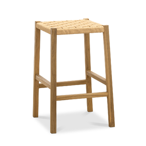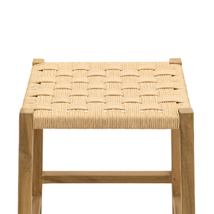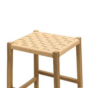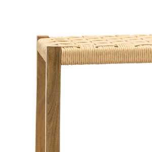 The Kyren Woven Rope Barstool is distinguished by its minimalist integration of natural teak and handwoven polyester rope. With quick-drying properties that suit both indoor and outdoor environments. The tapered leg design and integrated footrests provide ergonomic functionality, while the generous woven seat offers supportive comfort. Attention to craftsmanship is evident in the basketweave pattern and solid wood frame, achieving a balance between aesthetic refinement and everyday resilience. Arriving fully assembled, the Kyren provides functional elegance for contemporary Australian homes.