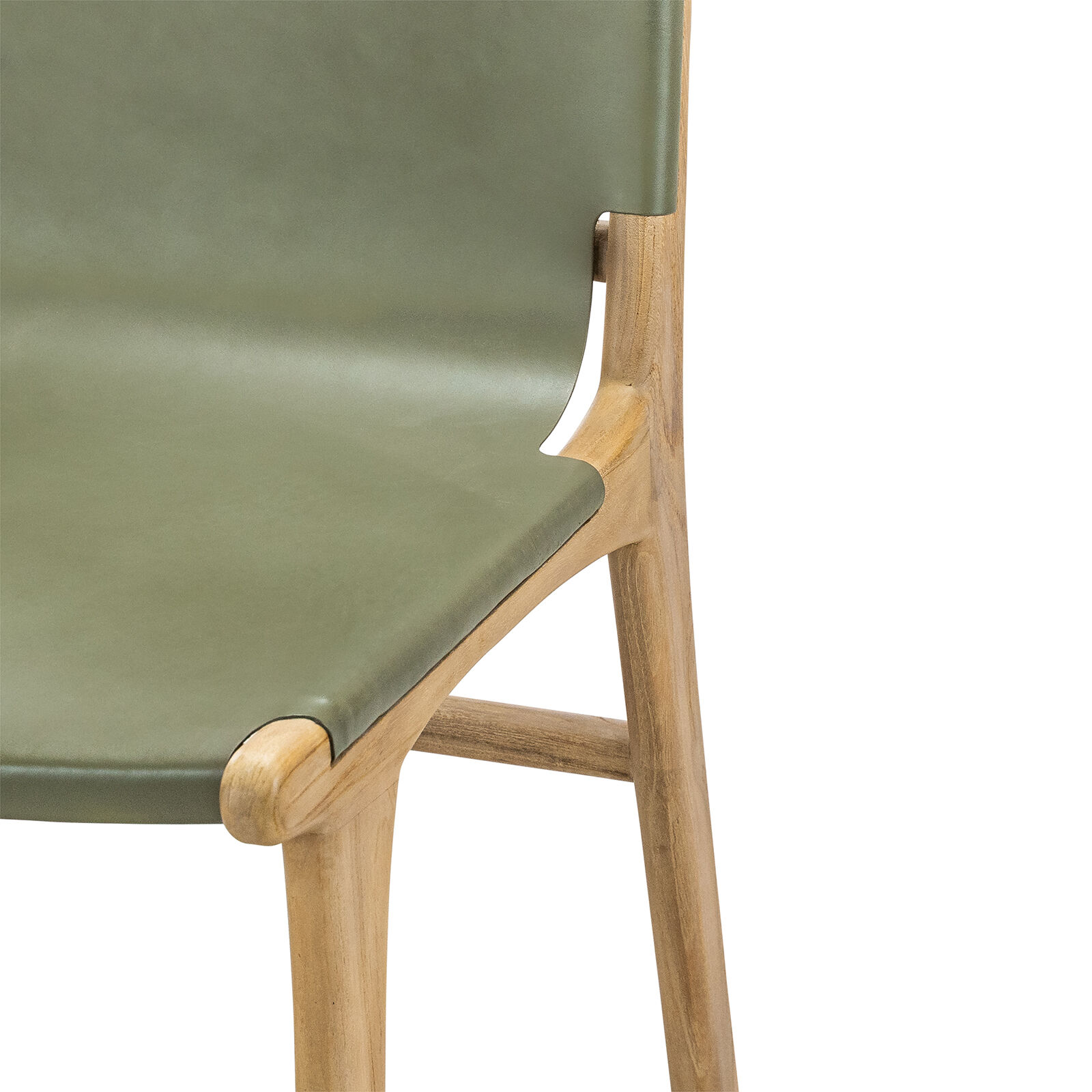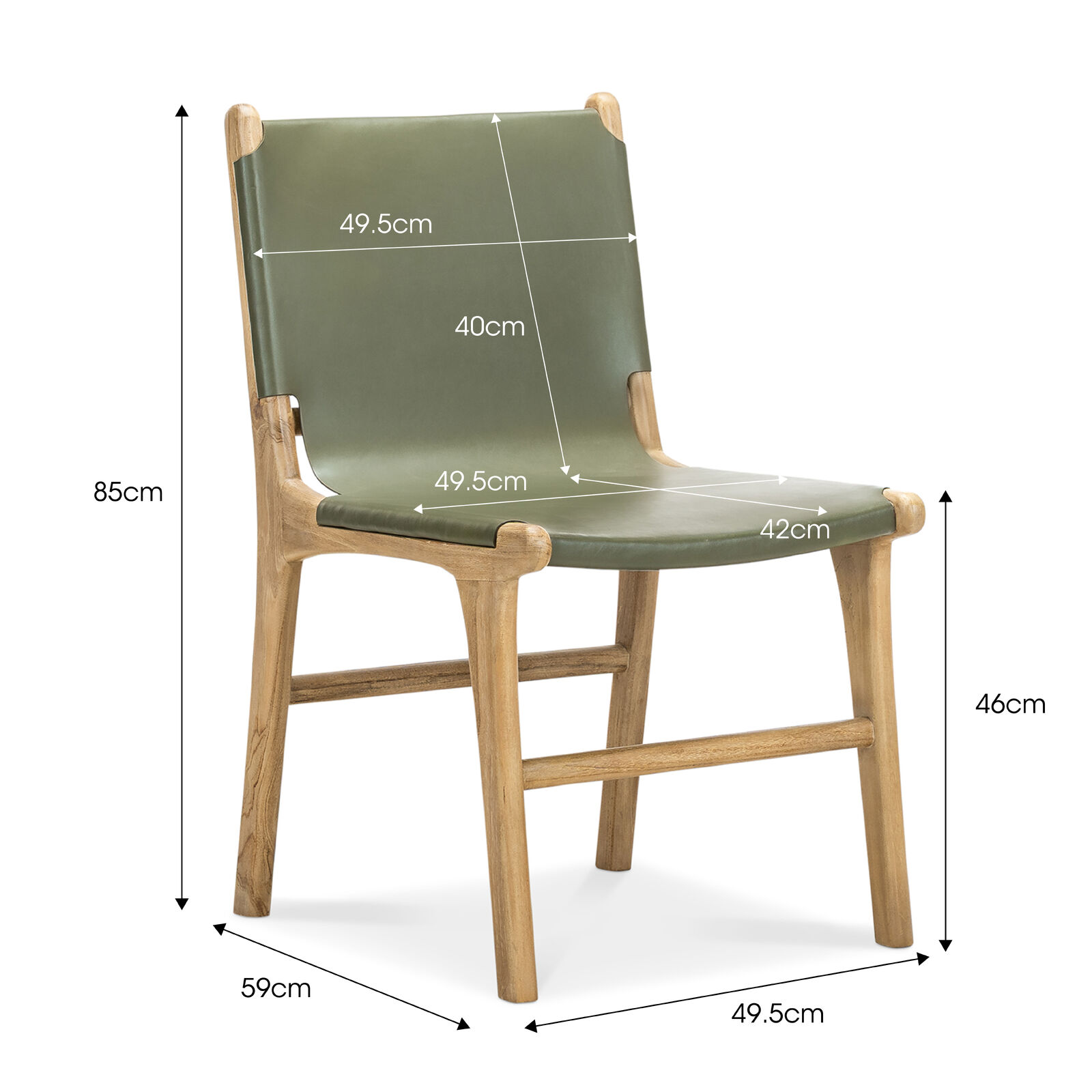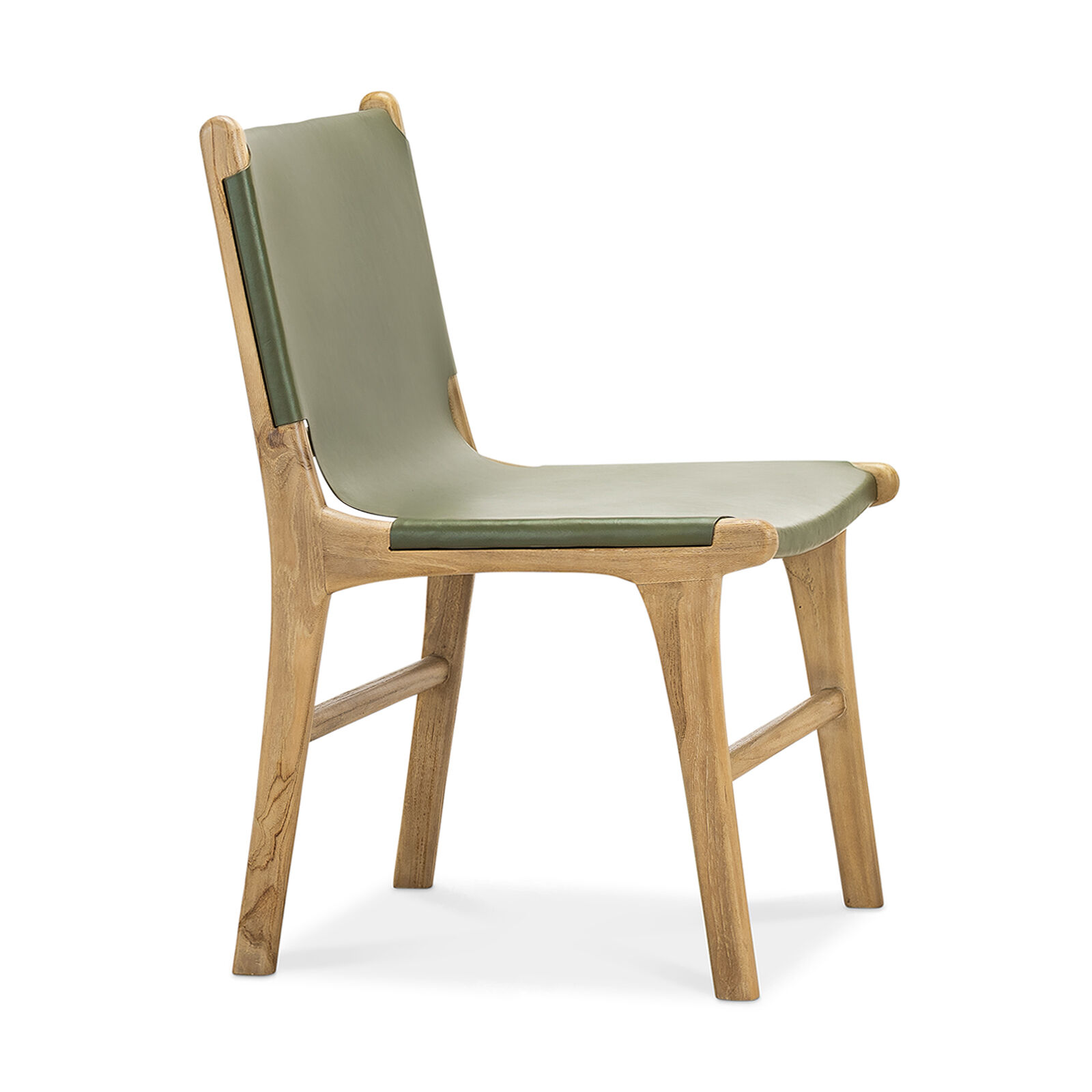 A perfect blend of comfort and style is embodied by the Lazie Leather Sling Dining Chairs in a rich Olive Green. Crafted with meticulous attention to detail, these Danish Contemporary influenced dining chairs feature a leather piece slinged onto a sustainable natural teak hardwood frame to offer comfort and support in a relaxed on-trend style. The frame is finished in a clear satin varnish allowing the beautiful teak grain to shine and adds warmth to the overall design. The Lazie Sling Dining Chair effortlessly elevates a large variety of dining table options, making them versatile additions to your dining experience.
