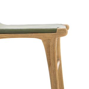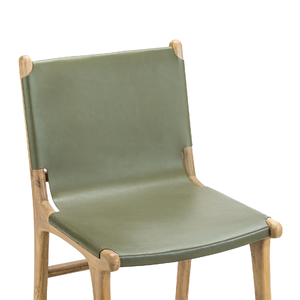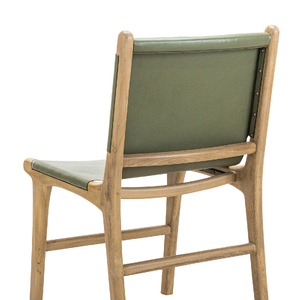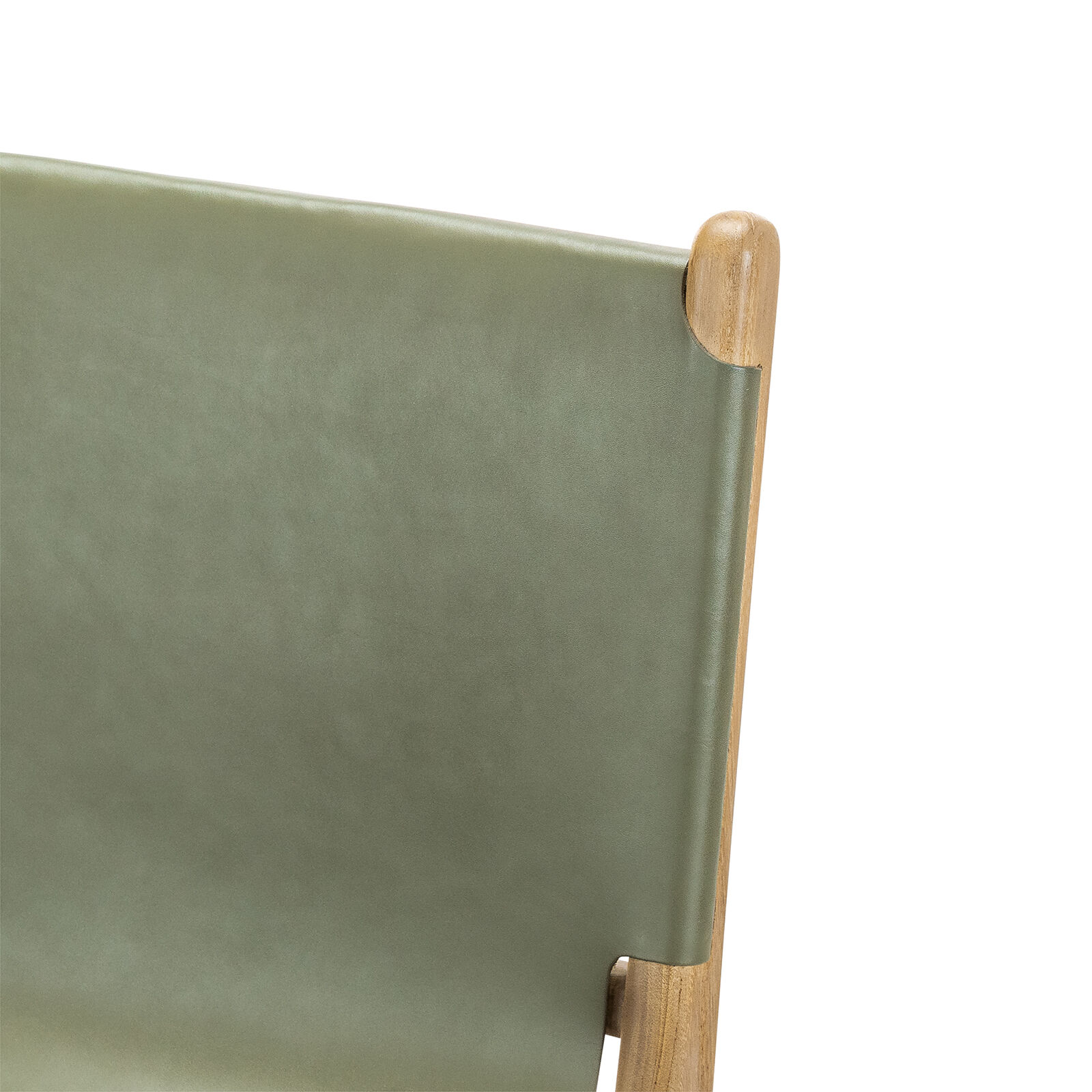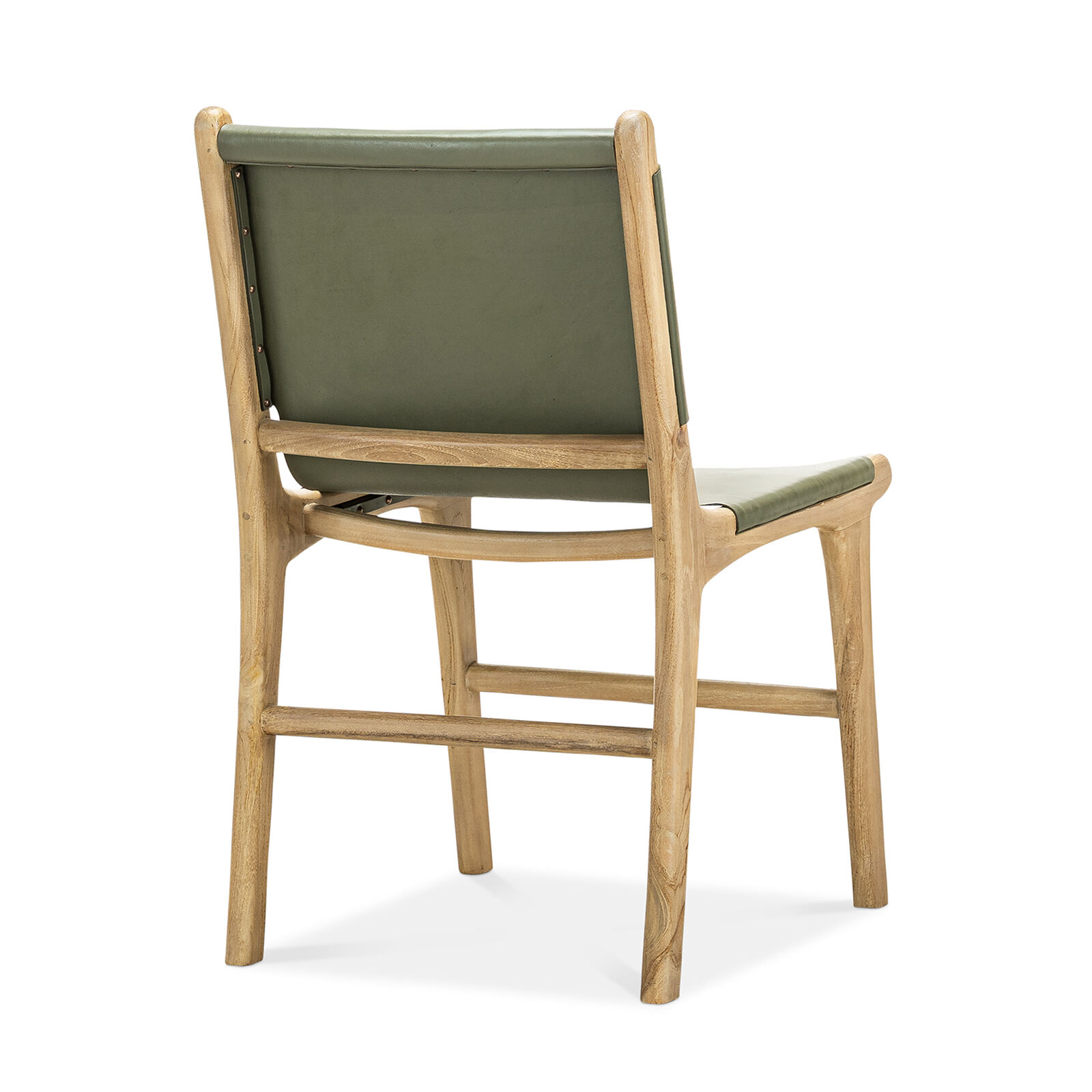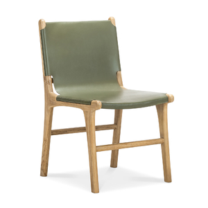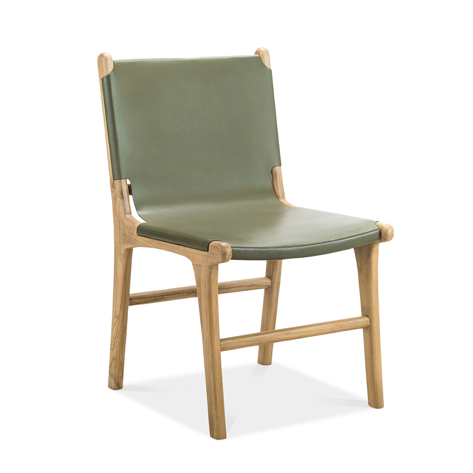 A perfect blend of comfort and style is embodied by the Lazie Leather Sling Dining Chairs in a rich Olive Green. Crafted with meticulous attention to detail, these Danish Contemporary influenced dining chairs feature a leather piece slinged onto a sustainable natural teak hardwood frame to offer comfort and support in a relaxed on-trend style. The frame is finished in a clear satin varnish allowing the beautiful teak grain to shine and adds warmth to the overall design. The Lazie Sling Dining Chair effortlessly elevates a large variety of dining table options, making them versatile additions to your dining experience.
