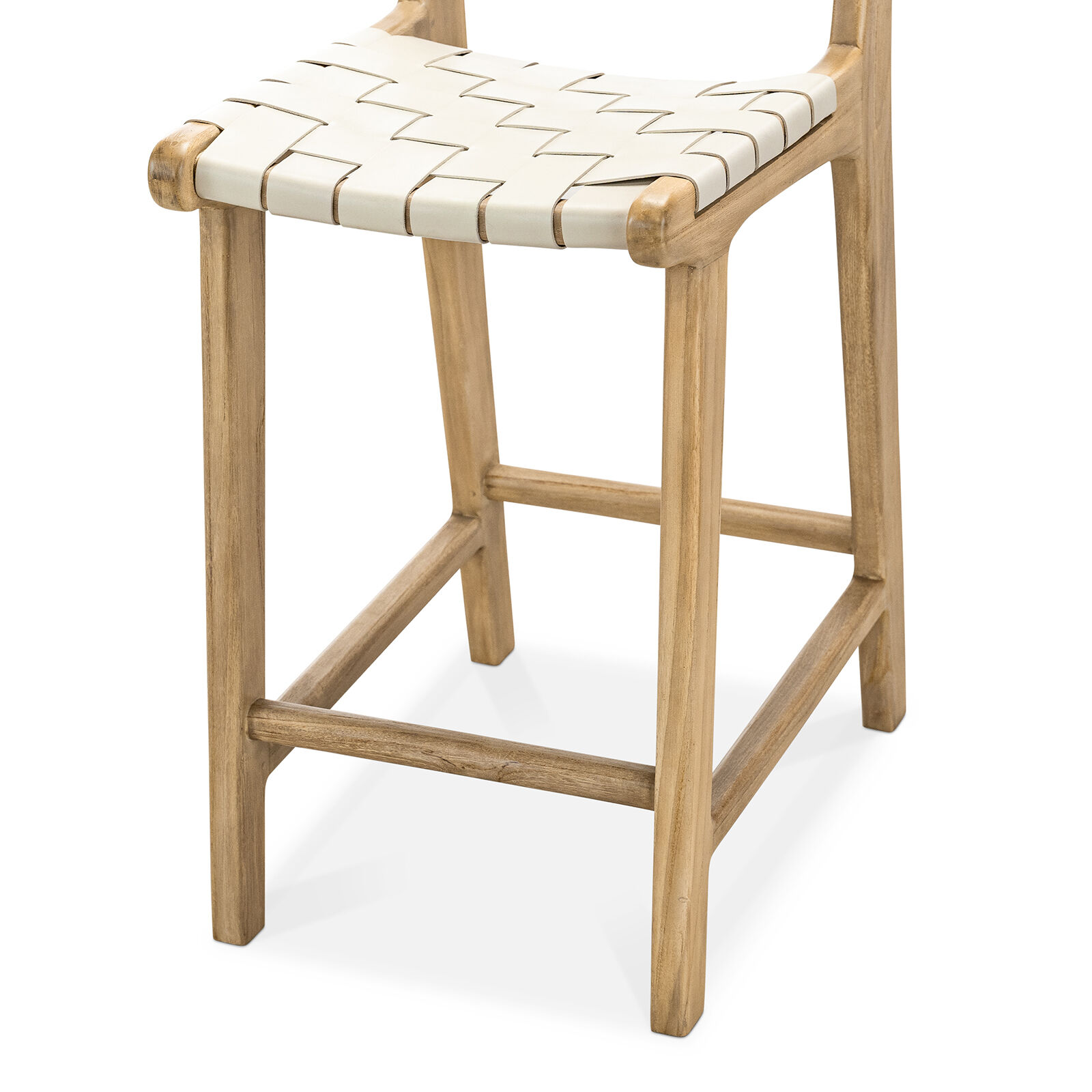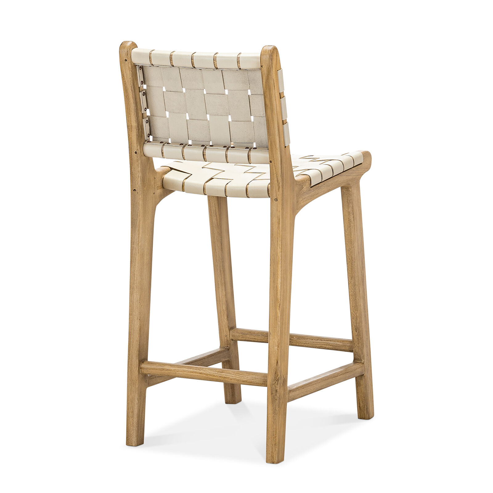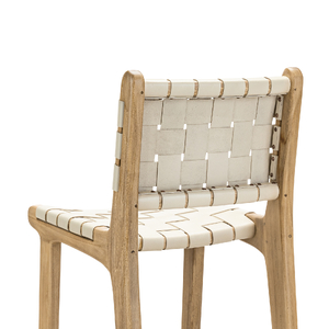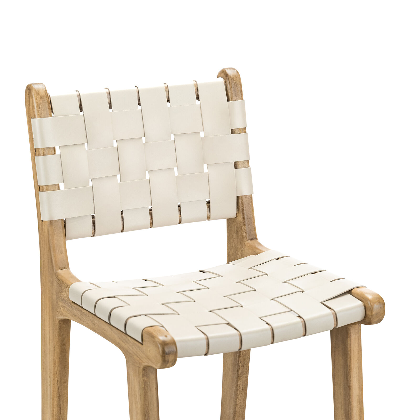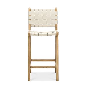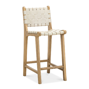 Indulge in the refined beauty of handwoven leather artistry. The Lazie Woven Leather High Back Counter Stool plays to tactile luxury and form while exhibiting a splendid show of artisan detail. The counter bar stool features a glorious woven leather backrest and seat featuring 5cm genuine leather straps, the cross weaved pattern creates visual intrigue and maintains lasting suspended comfort. Thanks to its solid hardwood teak frame, the organic materials bring natural warmth to any setting, while the generous high back provides genuine support for extended seating. The Lazie is a sophisticated and inviting addition to your everyday kitchen counter needs, aging beautifully as it becomes part of your daily rituals.