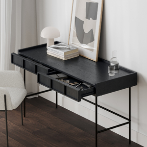 The Linea Desk offers a perfect blend of minimalist design and modern functionality, ideal for creating an inspiring home or office workspace. Measuring 140cm, this desk features two integrated drawers, providing discreet storage to keep your station organized and clutter-free. Its natural wooden finish with clean lines and signature board and batten-panelled design sits on top of a sleek metal frame, adding subtle texture and refined character. Whether you're working, studying, or simply organizing, elevate your productivity in style.